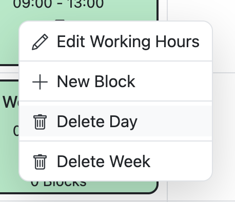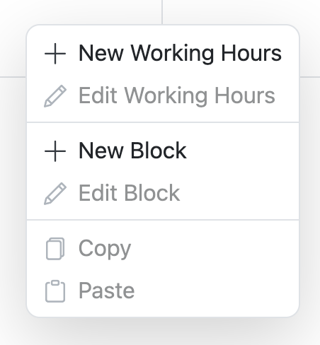 If you want to add hours and blocks to each day, right-click on the empty block and choose "New Working Hours"
