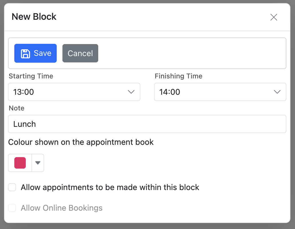 To prevent users from booking appointments during the blocked time, until the Allow appointments box.