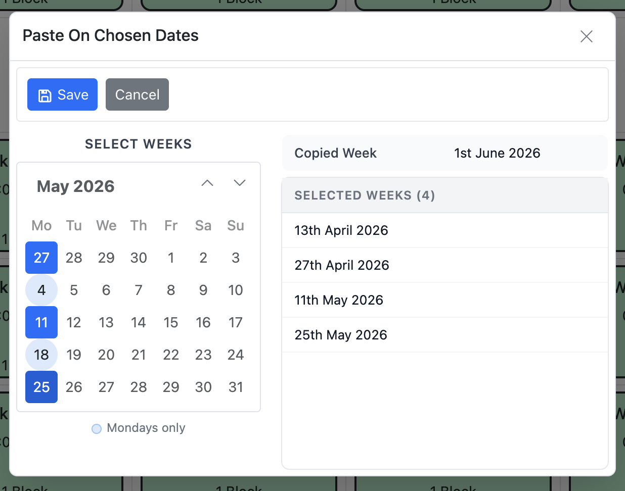 - Paste on Chosen Dates - use this to paste this week onto specific weeks, e.g. this is a bi-weekly rota.