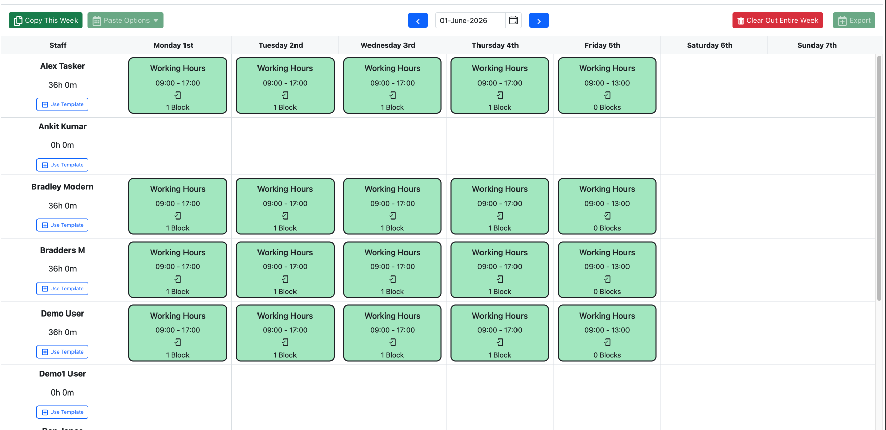 Choose a week to start on, then apply the template to staff (or add hours directly).