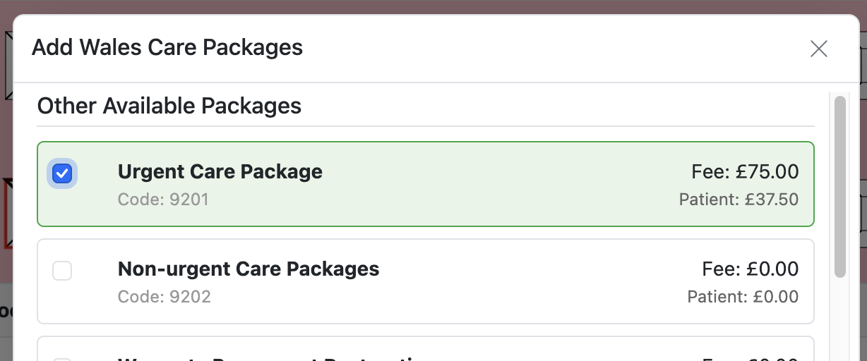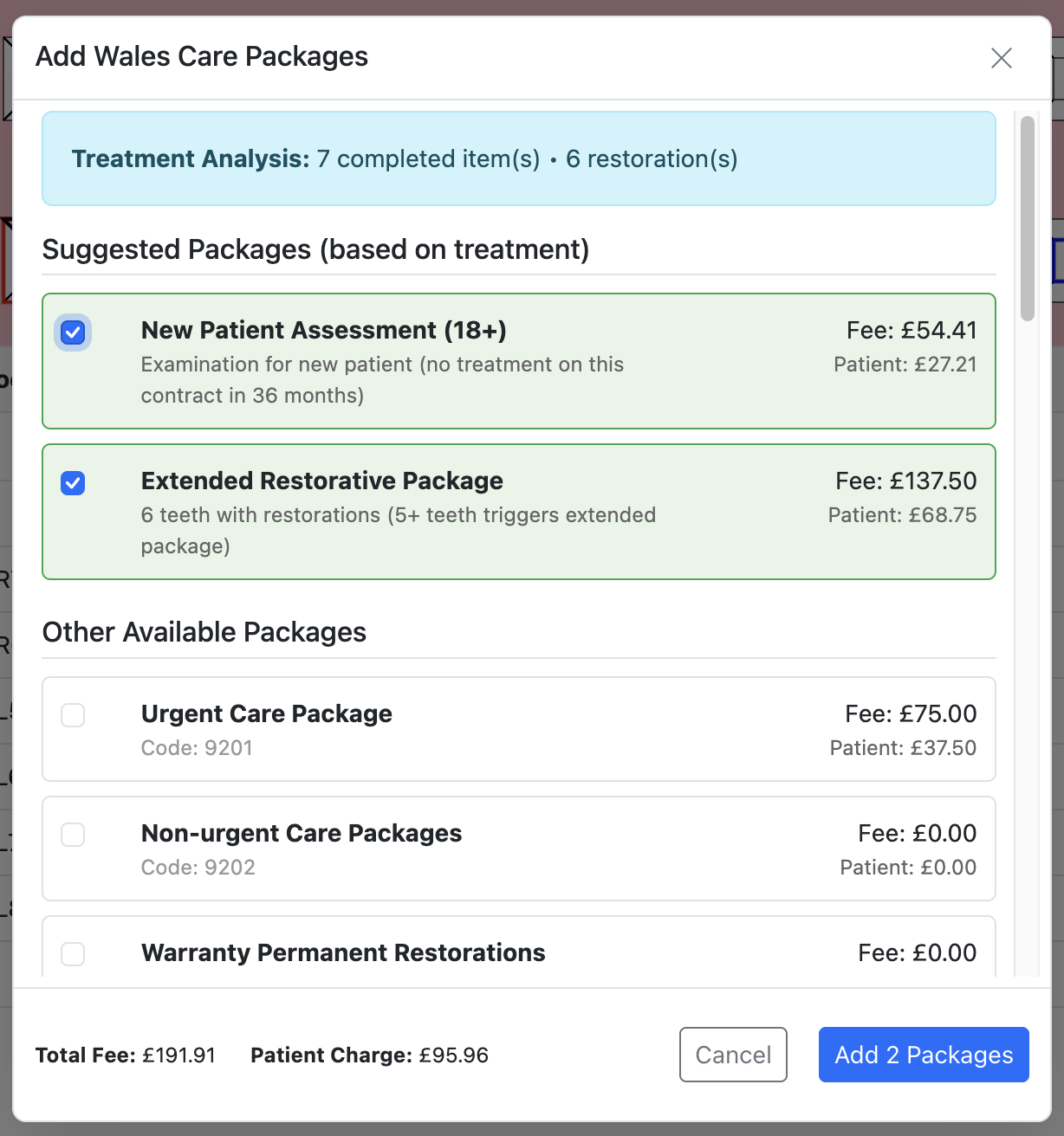 Care packages are a set of standardised treatment bundles (codes 9201–9223) that replace UDA banding for all Welsh NHS dental contracts. Each package has a fixed NHS fee paid to the practice and a fixed patient charge. The maximum a patient can be charged per course of treatment is £384.00 (excluding lab fees).