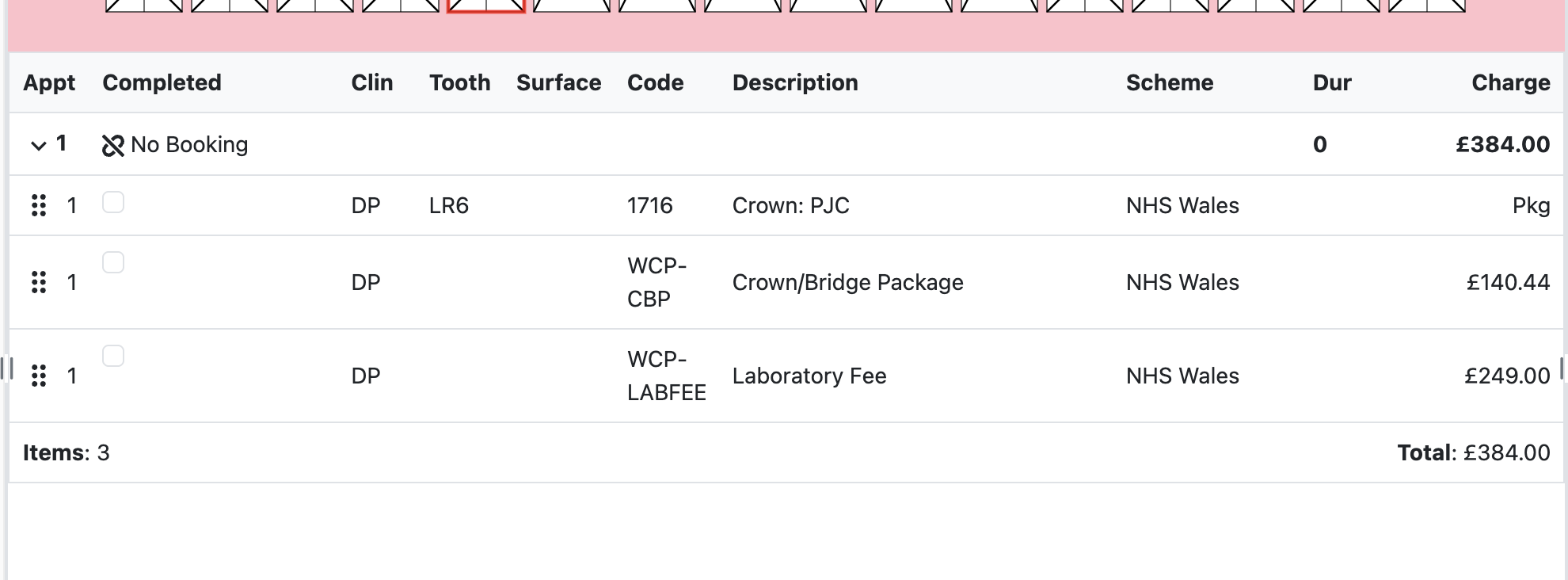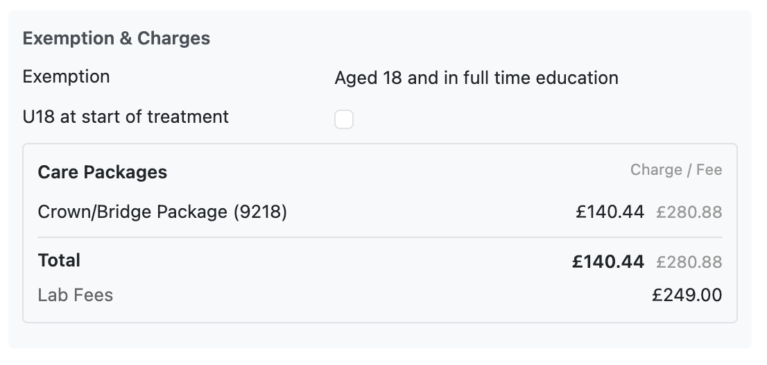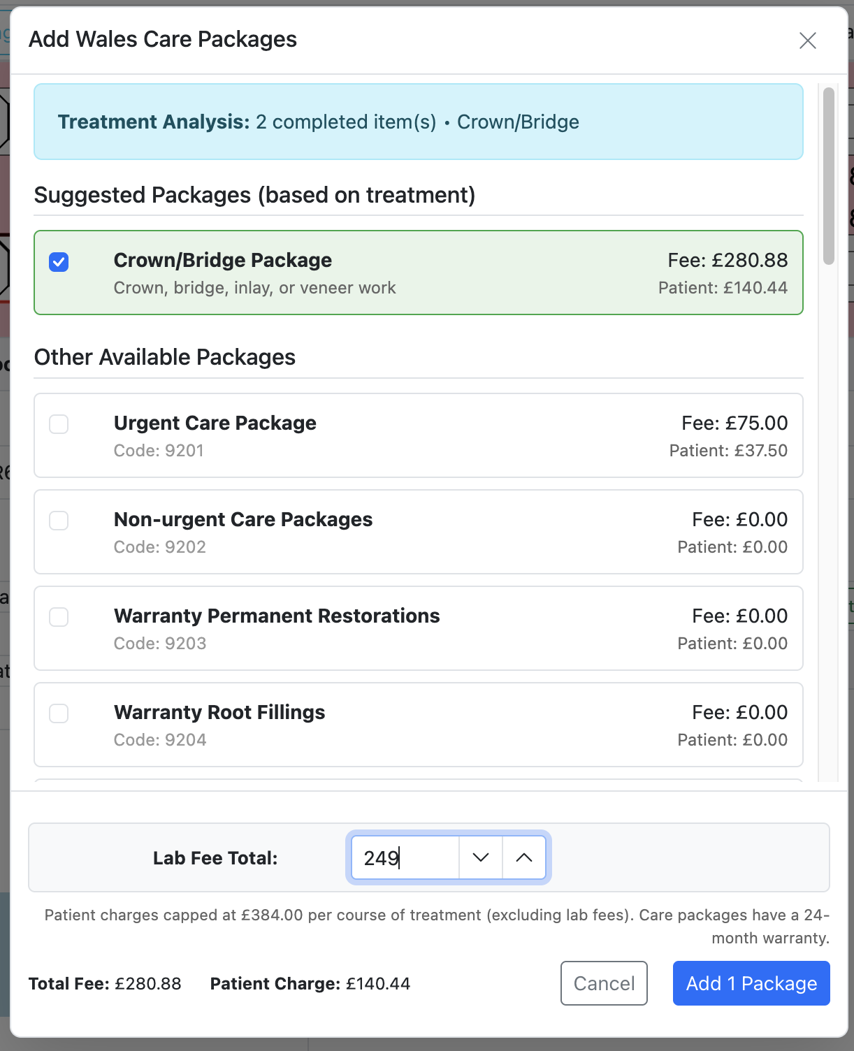 The total patient charge for a course of treatment is capped at £384.00. If the combined charges from selected packages exceed this amount, the system automatically reduces the charge to £384.00.